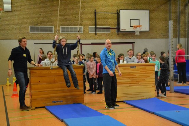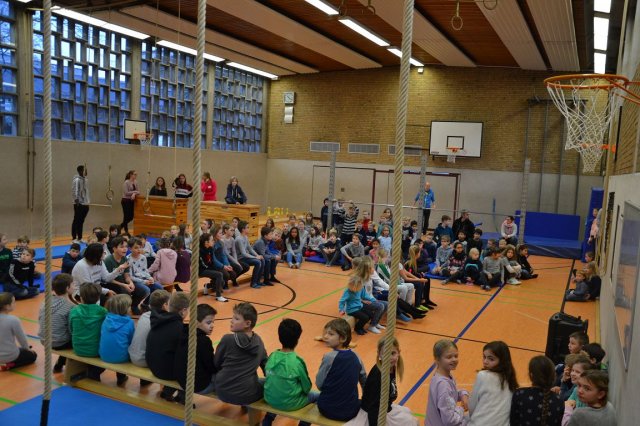 Während die Schulleiterin Frau Schöppner die versammelten Eltern im Forum mit einer Präsentation begrüßte, konnten die Kinder mit den Sporthelfern das erste Mal in der EKS-Halle „sporteln“.
