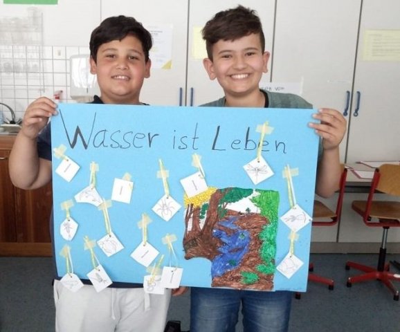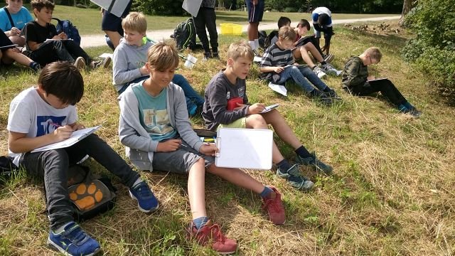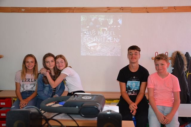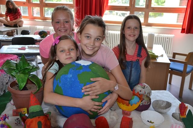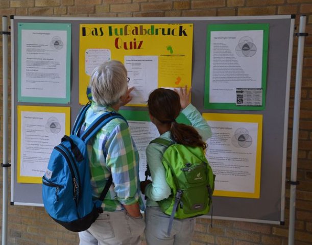 und diese dann am Freitag präsentieren. Neben zahlreichen handwerklichen Angeboten, wie dem Upcycling von Müll, dem Herstellen von eigenen Duschgels, dem Bau von Solarkochern, Arbeiten mit Pappmache, dem Bau von Insektenhotels und dem Aufwerten von Plastik gab es auch besonders kreative Angebote wie eine Umwelt-Musikgruppe, der szenischen Inszenierung zum Thema Nachhaltigkeit und die „Blue (Wo)Men Group“. Wer es eher sachlicher haben wollte, konnte sich bei den Trash-Tutorials, der genaueren Beschäftigung mit Bienen, dem Meer, dem Wasser oder dem ökologischen Fußabdruck einbringen. Außerschulische Lernorte wie im Allwetterzoo, dem Münsteraner Wochenmarkt, dem Tipicamp Hembergen, dem bewussteren Sport in der Natur und dem Besuch von besonderen umweltgerechten Kaufhäusern konnten ebenfalls gewählt werden.