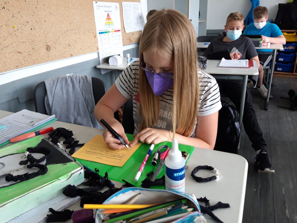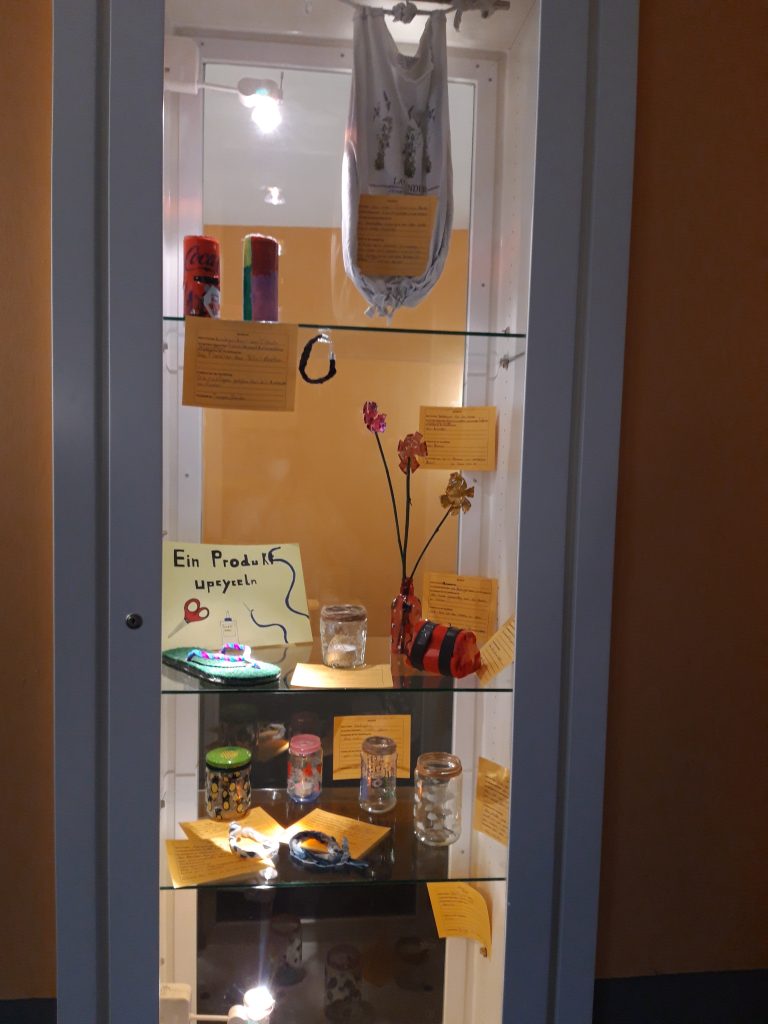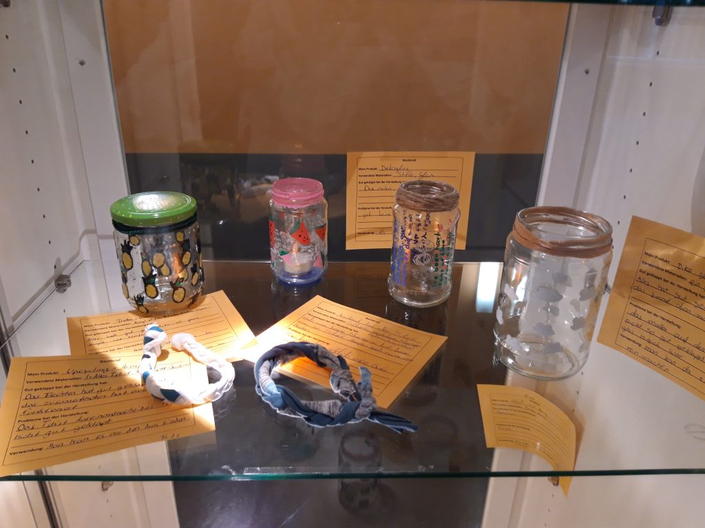 Dabei wurden vorherige „Abfall“-produkte und nicht mehr genutzte Stoffe in neuwertige Produkte umgewandelt. So wurden aus alten T-Shirts Taschen oder Armbänder gefertigt. Selbst verfasste Erklärungen zu den Ergebnissen können mit Hilfe der hinterlegten QR-Codes abgerufen werden.