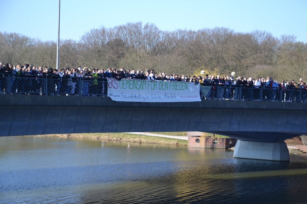 „Wir wollen ein Zeichen dafür setzen, dass unser größtes, gemeinsames Ziel der Frieden ist.“ Das Motto der EKS „Gemeinsam für den Frieden“ wurde unter der Regie der Kunstlehrerin Frau Große-Wöstmann von Schülerinnen des 10. Jahrgangs künstlerisch umgesetzt.