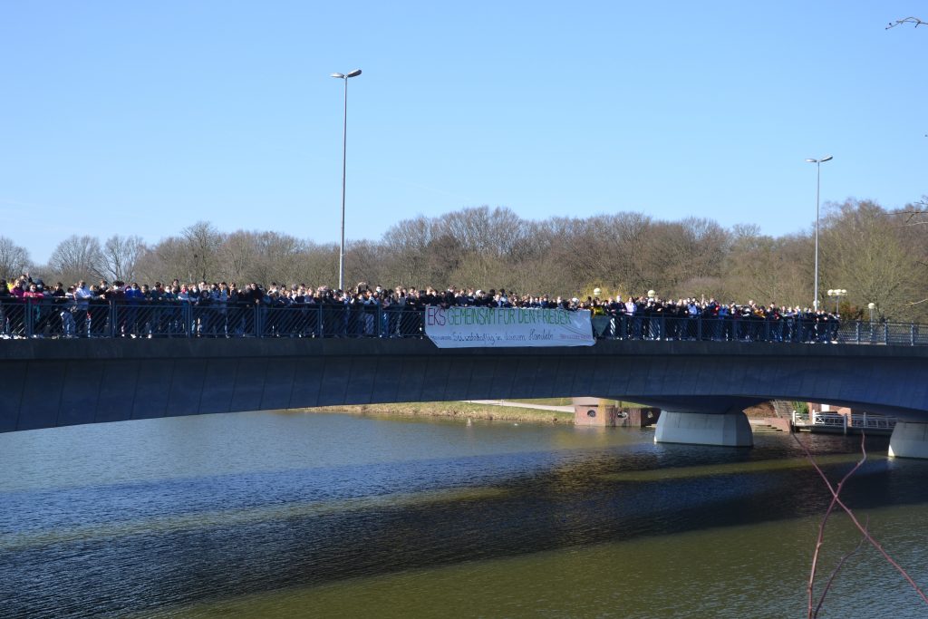 Das neun Meter lange und eineinhalb Meter hohe Banner wurde in einer beeindruckenden Aktion an der Torminbrücke am Aasee durch mehr als 300 Schülerinnen und Schüler der Schule öffentlich gemacht und anschließend am Schulgebäude zur Aasee-Seite befestigt, von wo es weit sichtbar, sogar von der anderen Seite des Aasees aus, zu sehen ist.