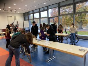 In diesem Zusammenhang überprüften Helferinnen und Helfer aus der Klasse 8 zusammen mit Auszubildenden des Ketteler Berufskollegs die Räder unserer Fünft– und Sechstklässler. Knapp 60 Fahrräder wurden einem gründlichen Check unterzogen. Frontlicht, Rücklicht, Bremsen, Schaltung, Reflektoren und natürlich auch die Klingel wurden von unseren Monteuren auf Herz und Nieren geprüft.