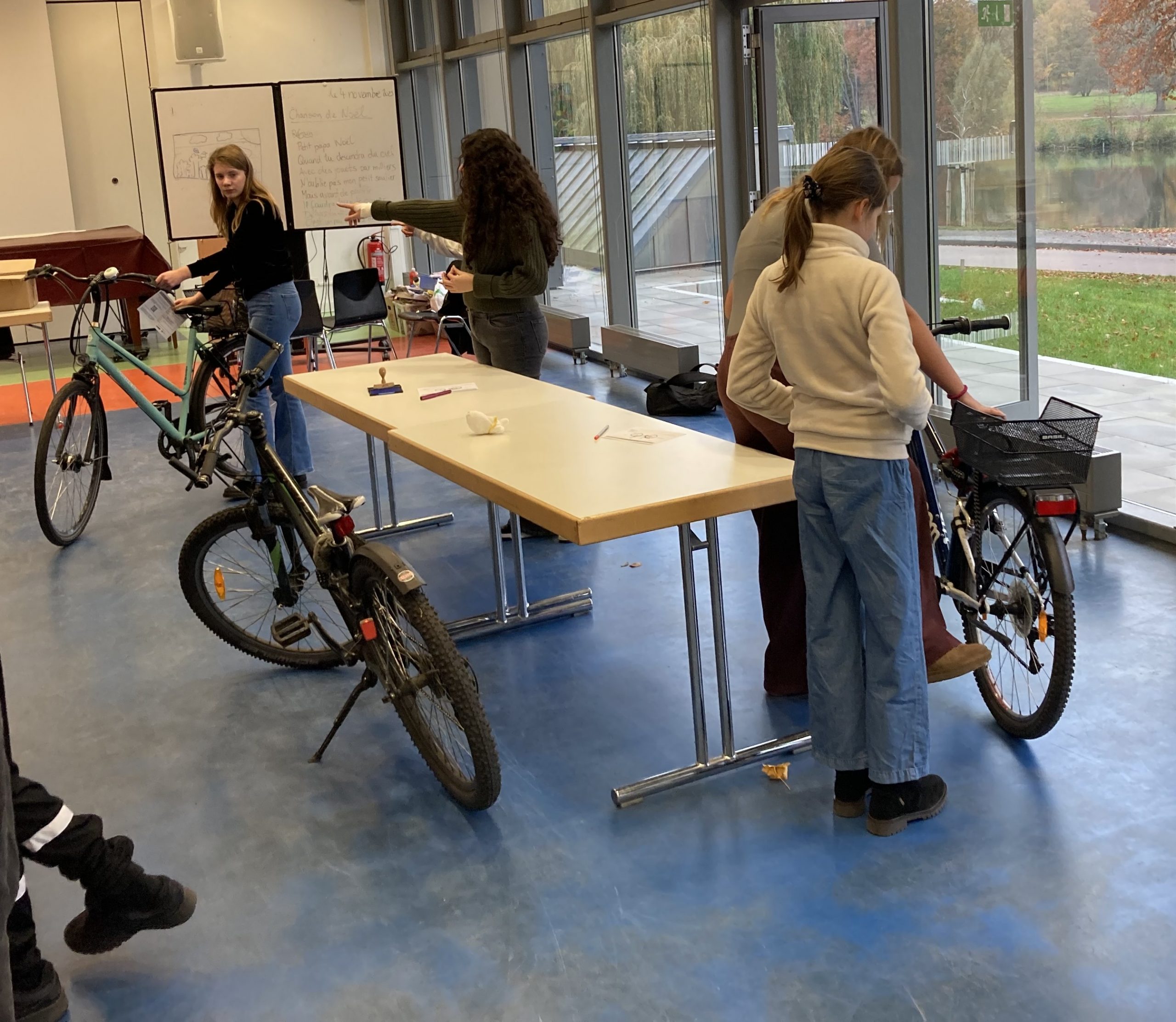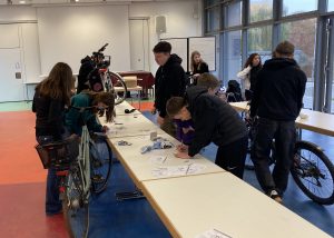 In diesem Zusammenhang überprüften Helferinnen und Helfer aus der Klasse 8 zusammen mit Auszubildenden des Ketteler Berufskollegs die Räder unserer Fünft– und Sechstklässler. Knapp 60 Fahrräder wurden einem gründlichen Check unterzogen. Frontlicht, Rücklicht, Bremsen, Schaltung, Reflektoren und natürlich auch die Klingel wurden von unseren Monteuren auf Herz und Nieren geprüft.