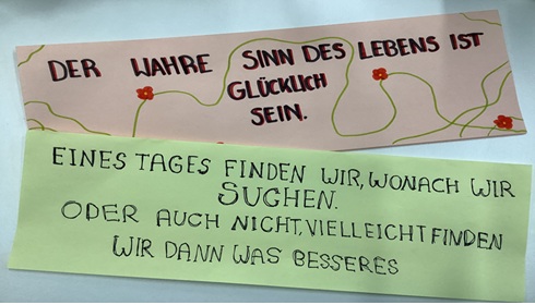 Warum sind wir nicht einfach glücklich? Manchmal muss man einen Moment innehalten und durchatmen, man muss überlegen, worin eigentlich der Sinn des Lebens liegt. Muss es wirklich dieses tolle Piercing sein? Die Schuhe, die man schon immer haben wollte? Viele Menschen haben weniger als wir und sind zufrieden. Der Kurs Religion der Klasse 10A hat sich damit auseinandergesetzt, was man tun kann, um seinem Leben einen Sinn zu geben.