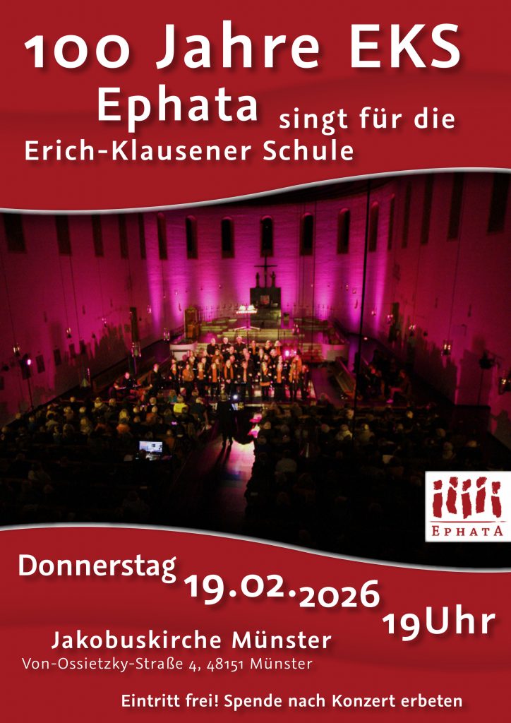 Der Gospelchor Ephata der Gemeinde St. Gottfried Münster, unter der Leitung von Hildegard Jacoby, gibt im Rahmen der Feierlichkeiten zum 100-jährigen Bestehen der Erich Klausener Schule ein Konzert. Präsentiert wird ein Programm von mitreißenden Praisingsongs bis zu gefühlvollen Balladen in der Jakobuskirche. Die rund 30 Sängerinnen und Sänger sind bekannt für ihren Spirit, der die Zuhörenden mitnimmt und mitswingen lässt.