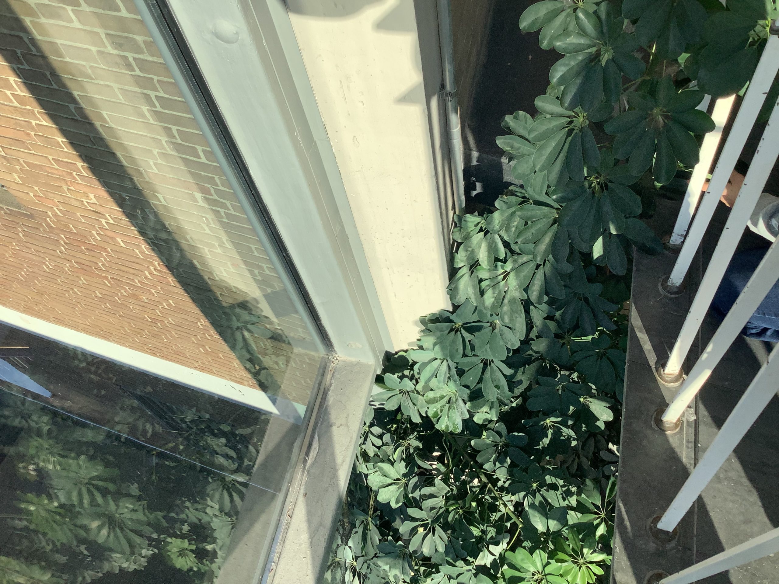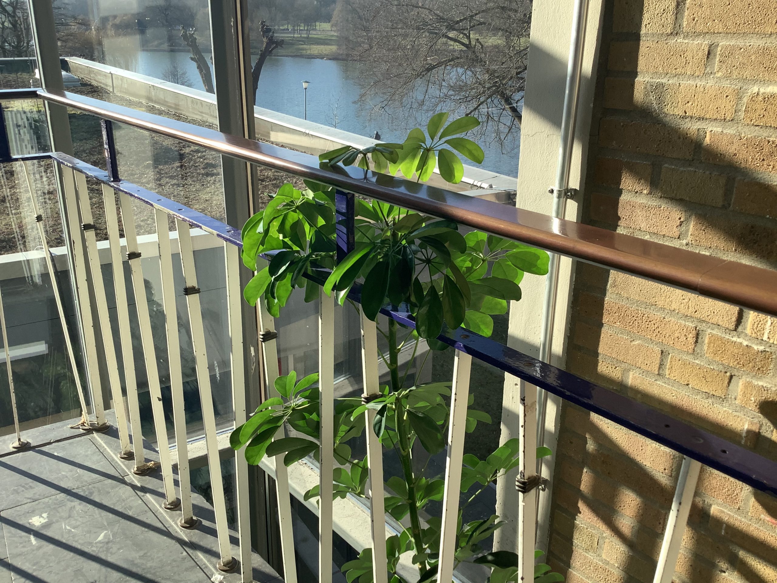 Der Strahlenaralie geht es aber offensichtlich richtig gut an unserer Schule. Ein junger Trieb reicht bis rauf in das zweite Stockwerk des Treppenhauses. Im ersten Stockwerk blüht sie an drei Stellen gleichzeitig.