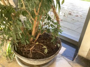 Uns fiel die dicke Staubschicht auf, die sich während der Bauarbeiten auf den Pflanzen niedergelassen hat. Kurzerhand bewaffneten wir uns mit Spritzflaschen und weichen Tüchern und fingen an vorsichtig die Blätter abzuwischen. – Dieses Projekt dauert noch an.