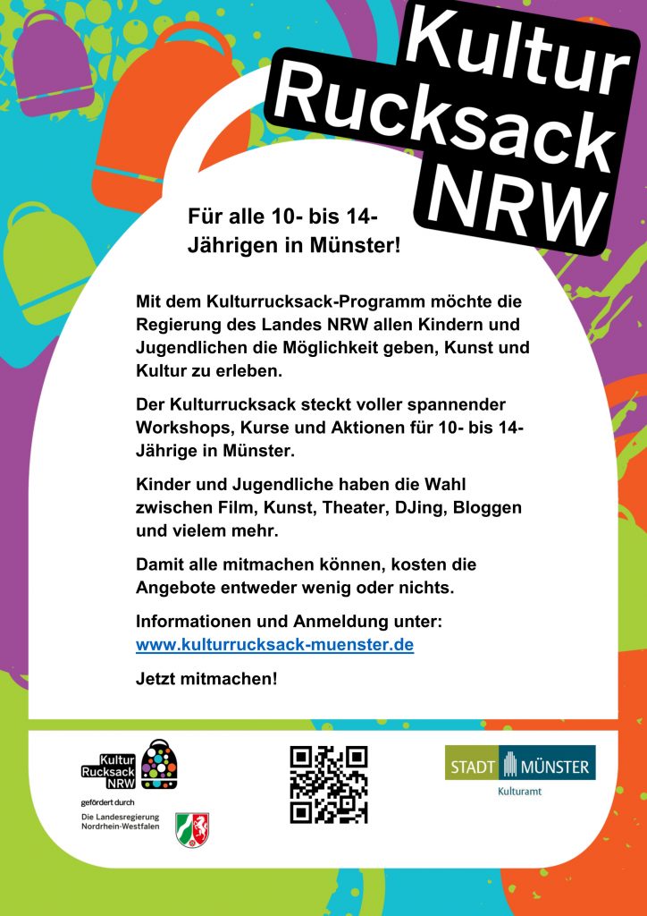 das Kulturrucksack-Programm des Landes NRW richtet sich an alle 10- bis 14-Jährigen und bietet zahlreiche Möglichkeiten, um die vielseitige Kulturlandschaft in Münster aktiv zu erleben und mitzugestalten.